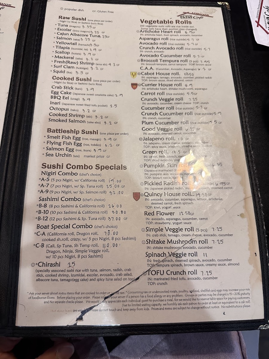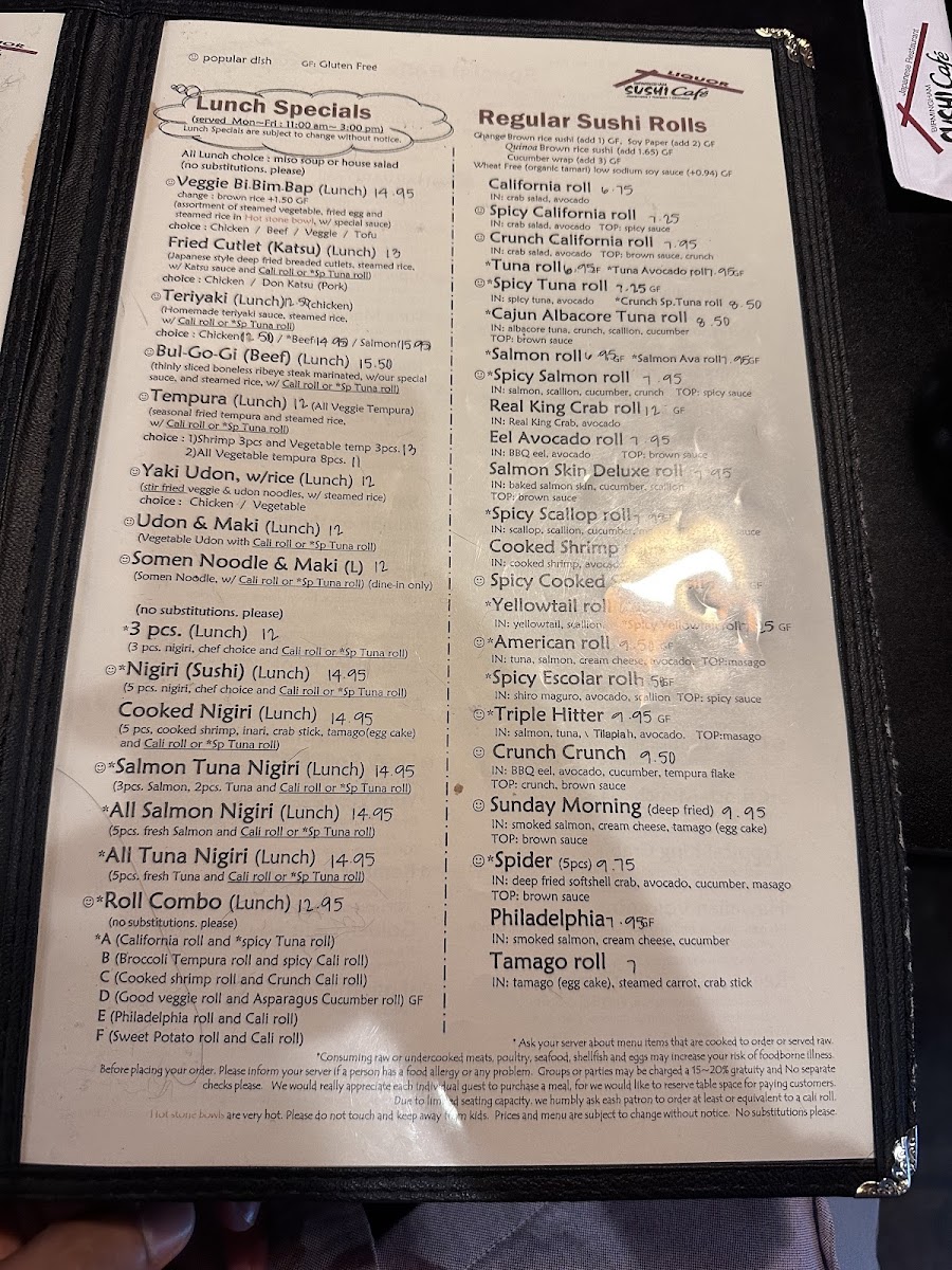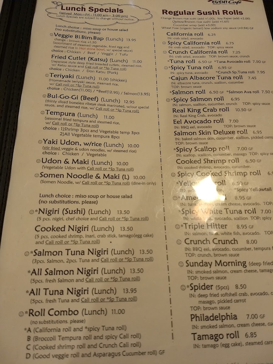 Sushi enthusiasts will adore the Sushi Combo Specials that offer a selection of exquisite rolls and sashimi. The B12 combo, featuring 12 pieces of chef's choice sashimi alongside a special tuna roll, is an experience not to be missed at $35.00. If you’re gluten-sensitive, the restaurant has taken care to provide a variety of options, indicated by a convenient * on the menu. The Spicy Yellowtail Roll at only $7.50 and the Crunch California Roll are perfect for both sushi novices and aficionados.